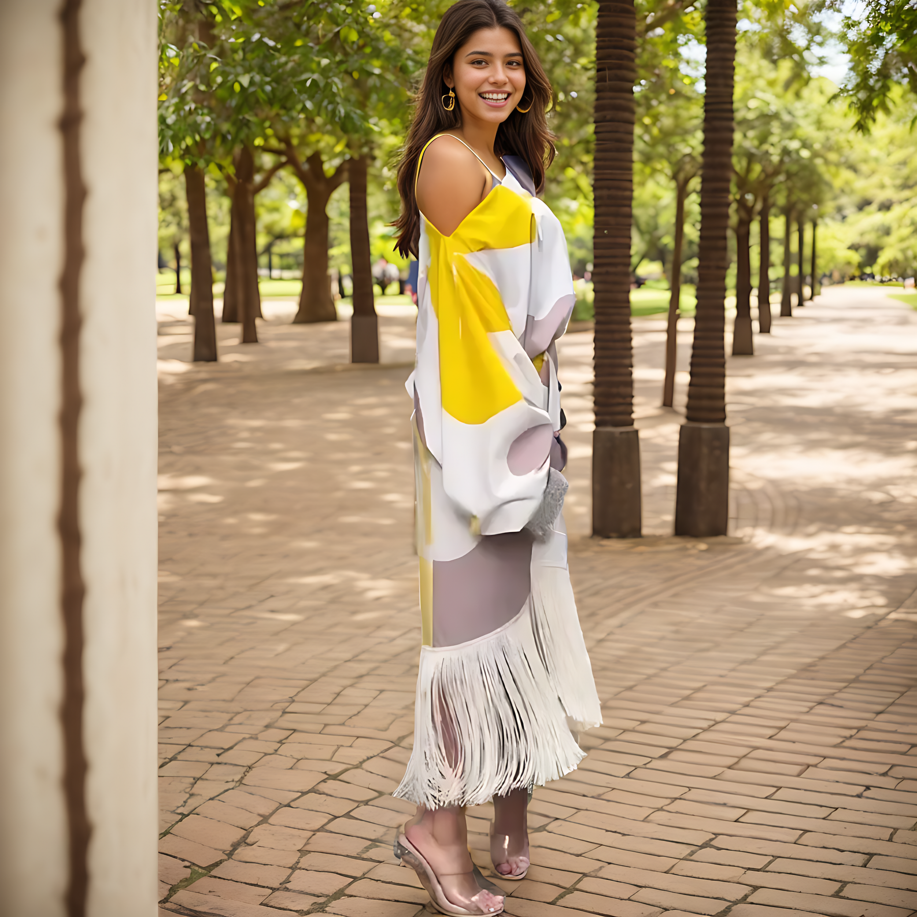 Grazie al suo tessuto di cotone e poliestere, è morbido al tatto e resistente; inoltre è fresco, il che lo rende perfetto per essere indossato nella prossima stagione. Il suo corte ampio e il suo design si adattano perfettamente a te, garantendo un eccellente vestibilità per qualsiasi figura. Le sue maniche a pipistrello gonfiate insieme alla gonna con frange e al fiocco davanti le danno un tocco moderno e al tempo stesso di eleganza. Avrai successo ovunque tu vada.